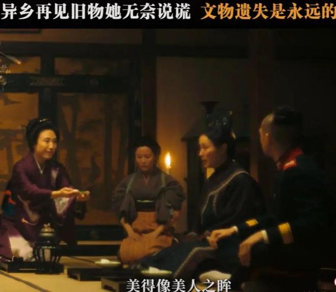 当然,吴越出彩的片段不止这一个。当她在日本皇室的家中看到一个翡翠玉镯时,她先是假意听错对方的问话,后是谎称这个物件绝对不是出自紫禁城中。这个反应可以说是非常智慧的,当然也突出了时代的悲剧,任谁,哪一个中国人都痛心看到这一幕。